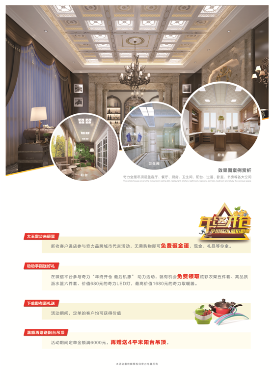 本次活動內(nèi)容豐富,新老客戶進(jìn)店參與奇力品牌城市代言活動,無需購物即可免費(fèi)砸金蛋,現(xiàn)金、禮品等你拿。活動期間,定單的客戶均可獲得精美禮品一份,驚喜不斷,活動連連,更多的內(nèi)容煩請進(jìn)店咨詢,走過路過奇力吊頂專賣店,一定不要錯(cuò)過。